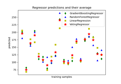 >>> from sklearn.ensemble import RandomForestRegressor >>> from sklearn.datasets import make_regression >>> X, y = make_regression(n_features=4, n_informative=2, ... random_state=0, shuffle=False) >>> regr = RandomForestRegressor(max_depth=2, random_state=0) >>> regr.fit(X, y) RandomForestRegressor(...) >>> print(regr.predict([[0, 0, 0, 0]])) [-8.32987858]