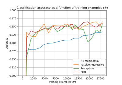 >>> from sklearn.datasets import load_digits >>> from sklearn.linear_model import Perceptron >>> X, y = load_digits(return_X_y=True) >>> clf = Perceptron(tol=1e-3, random_state=0) >>> clf.fit(X, y) Perceptron() >>> clf.score(X, y) 0.939...
